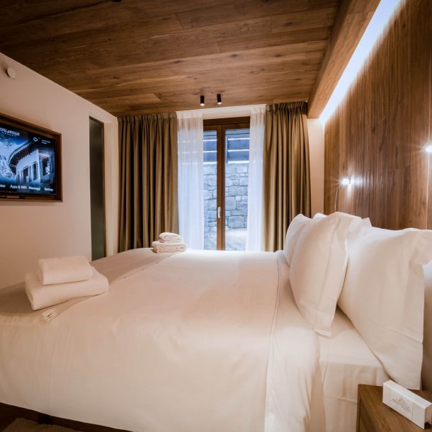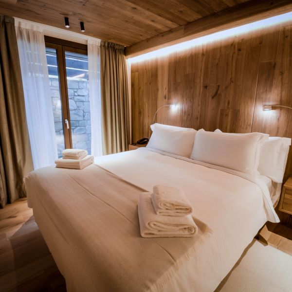 Situata nella parte interna della struttura, questa camera non dispone di vista sulle montagne circostanti, garantendo un’atmosfera tranquilla e riservata, ideale per chi cerca silenzio.